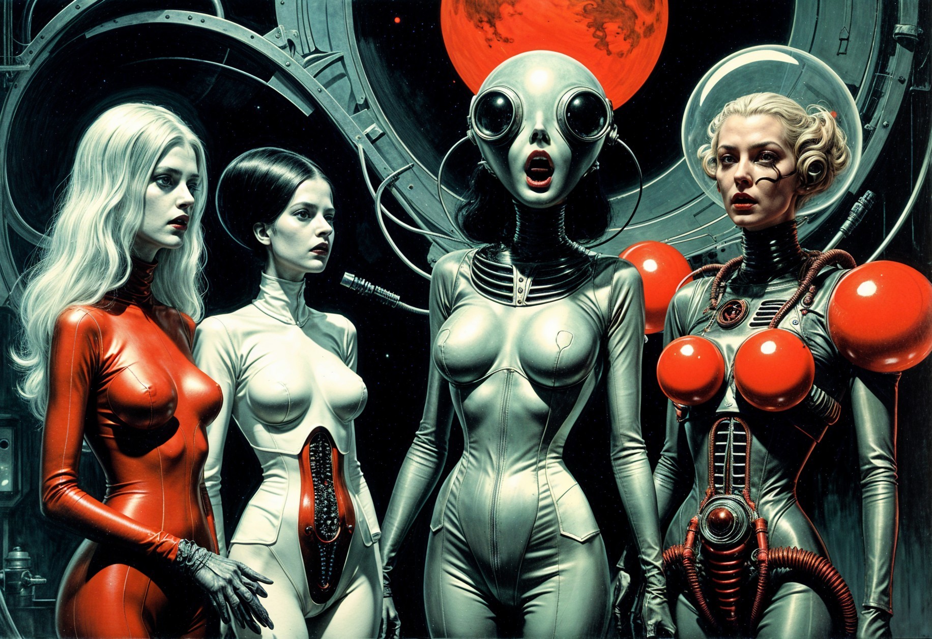 + Prompt:urreal, biomechanical horror artwork. Medium shot. A mad scientist and two screaming witches in retro-futuristic space-suits stand in front of a grotesque, eldritch silhouette. Mixed media collage. Bold, black lines, muted colors, vintage pulp horror comic aesthetic. Writhing, pulsing tendrils, glowing red orbs. Tattered fabrics, reflective visors, twisted helmet. Eldritch silhouette, looming, imposing. H.R. Giger, Zdzisław Beksiński, Bill Sienkiewicz influences. Cosmic horror, retrofuturism, surrealism, impending doom, madness. Dark, muted colors, eerie atmosphere, haunting shadows. Grotesque, nightmarish, disturbing, unsettling.