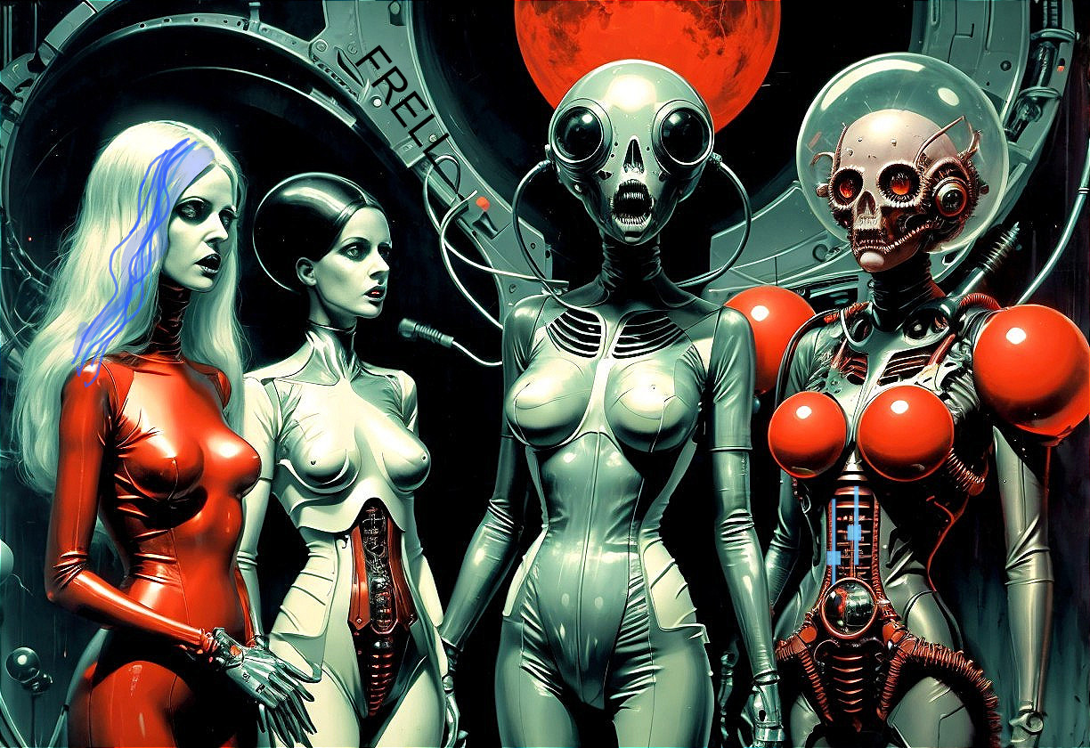 In a futuristic setting, three humanoid aliens and a cyborg stand together. Their sleek, metallic bodies contrast with an eerie red moon in the background, creating a surreal sci-fi atmosphere.