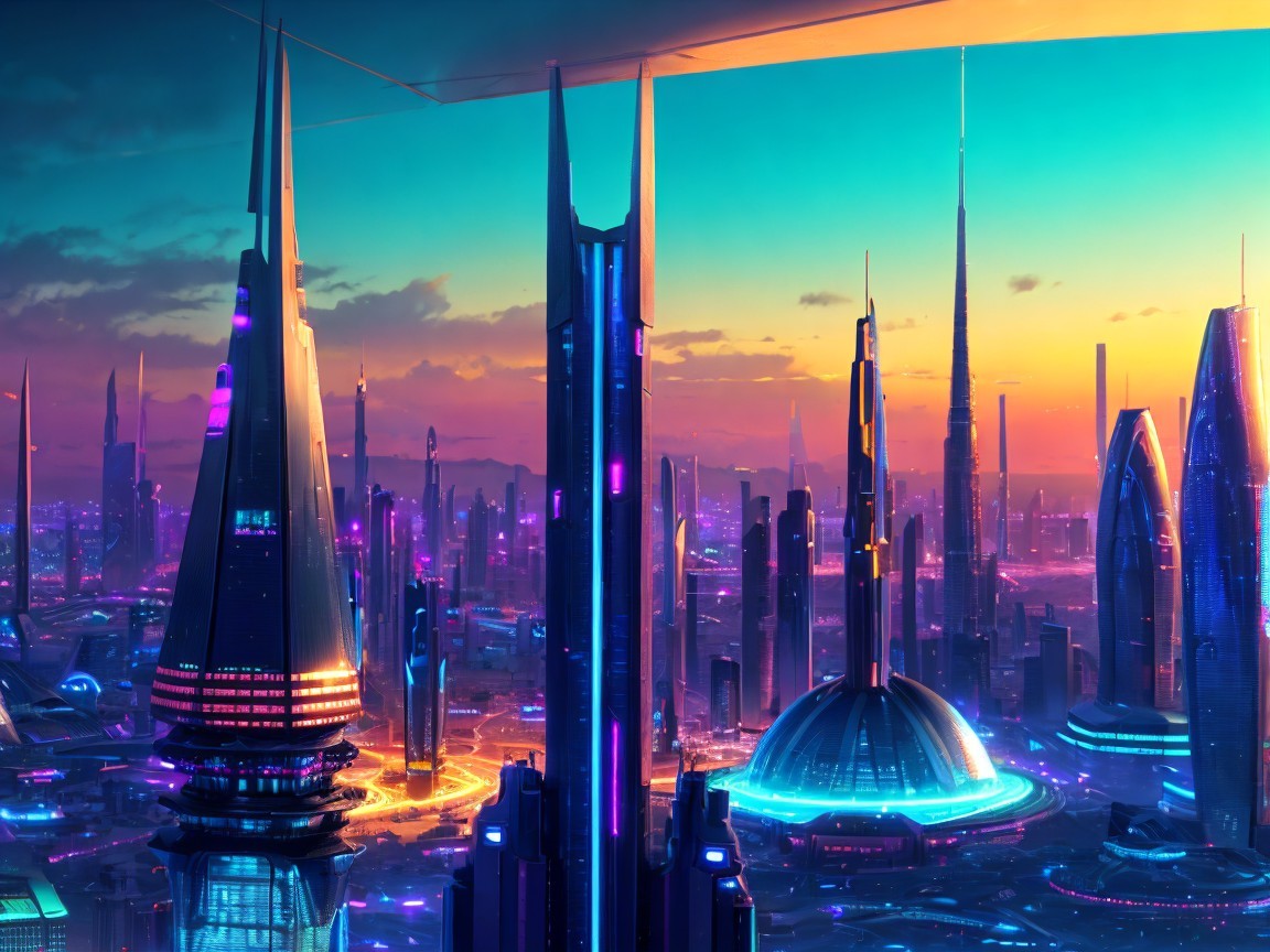 A stunning futuristic cityscape featuring sleek, towering skyscrapers with sharp lines, illuminated by vibrant neon lights against a glowing sunset backdrop, creating a mesmerizing sci-fi atmosphere.