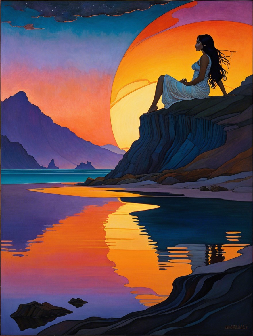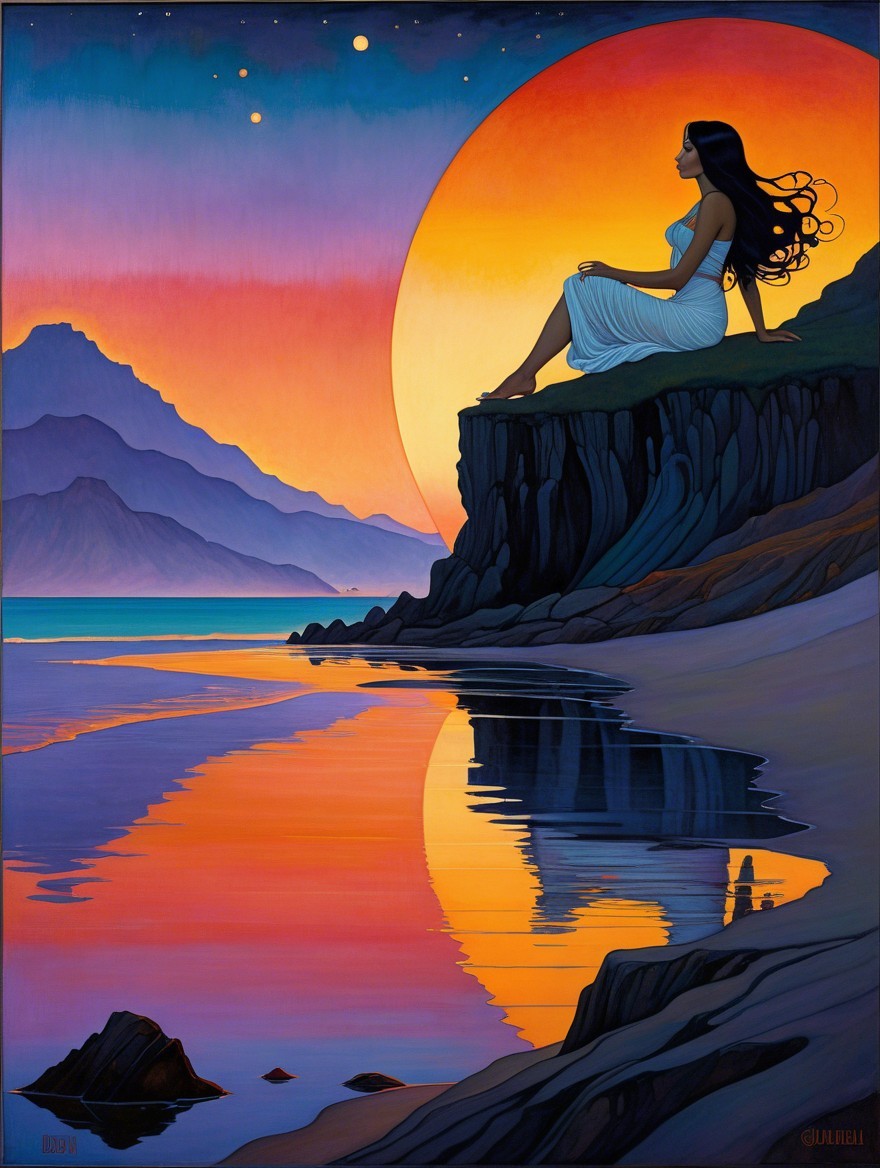 + Prompt:Guatemalan woman with Long flowing black Hair, sitting on gulf coast, starfire, Style: Möbius, Daniel Merriam, Egon Schiele, Alphonse Mucha, Anna Dittman, illustration