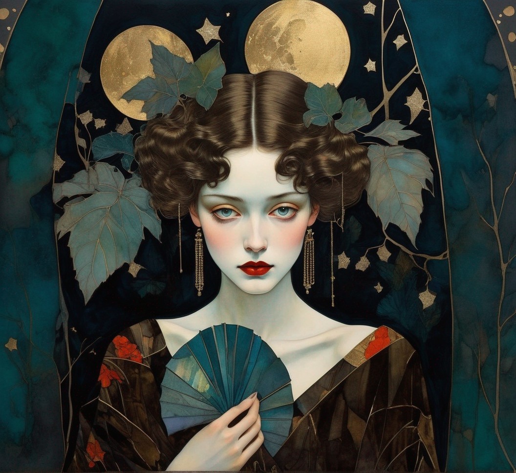 + Prompt:Oh, how wild a night and she's dressed in moonlight - in her secret garden. Deathly pale and ghostly.