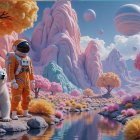 A vibrant, surreal scene featuring an astronaut in a colorful landscape with whimsical trees and a majestic bear at their side. Cosmic planets loom in the sky, enhancing the dreamlike atmosphere.