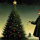 A child with pink hair stands beside a decorated Christmas tree under a starry sky. The tree is adorned with colorful lights and a shining star on top, creating a festive atmosphere.