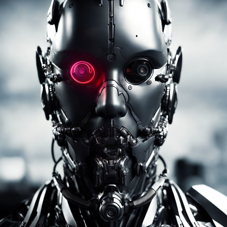 Detailed Female Robot with Blue and Purple Eyes on Gray Background