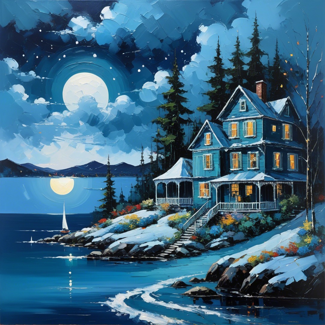 A tranquil winter scene features a charming teal house by a serene lake, surrounded by snowy landscapes and tall trees, under a starry sky illuminated by a bright moon.