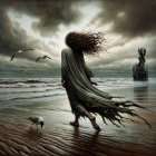 A young woman in a flowing green dress stands on a beach, her hair billowing in the wind. A distant ship sails on the ocean, under a dramatic sky filled with clouds at sunset.