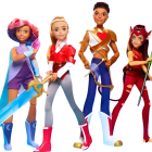 A vibrant lineup of action figures showcasing diverse superhero characters in colorful costumes, wielding weapons and displaying unique styles, exuding confidence and power.