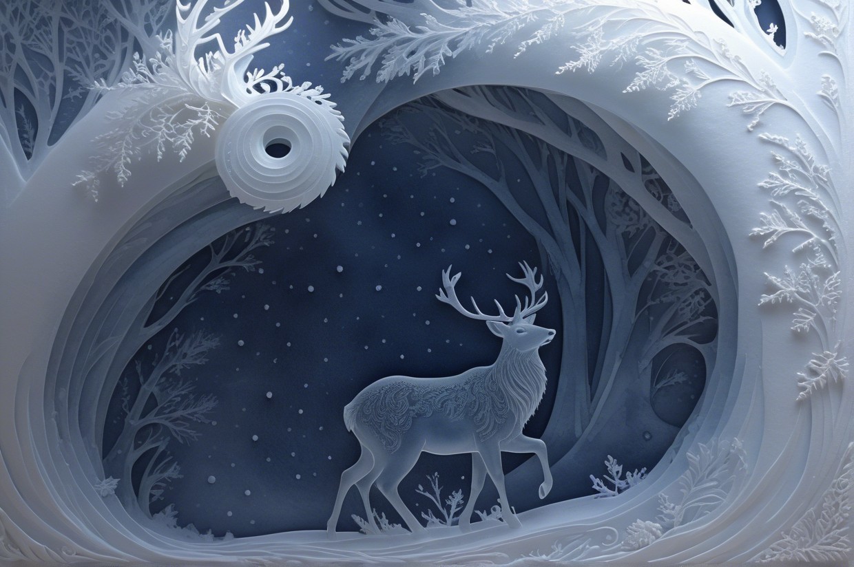 Intricately detailed etched salt frosted iced watercolor ink painting of highly imaginative swirling curving spiralling branching fibonacci jack frost winter wonderland, Beautiful white stag, deer, snow carving with intricate background details, white paisley, 3d, decorative snow carving. Keith Jennings style, monogram, engraving of an extraordinarily beautiful stag, deer, snow carving, perfect beautiful antlers, delicate white deer, forest, spiralling branching floral-like plants, cosmos, galaxies, northern lights, arthur rackham, van gogh, monet, maxfield parrish