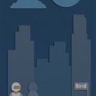 In a neon-lit urban landscape, two figures wear futuristic sunglasses. A giant moon hangs in the vibrant sky, with flying vehicles and silhouettes of city dwellers enhancing the cyberpunk aesthetic.