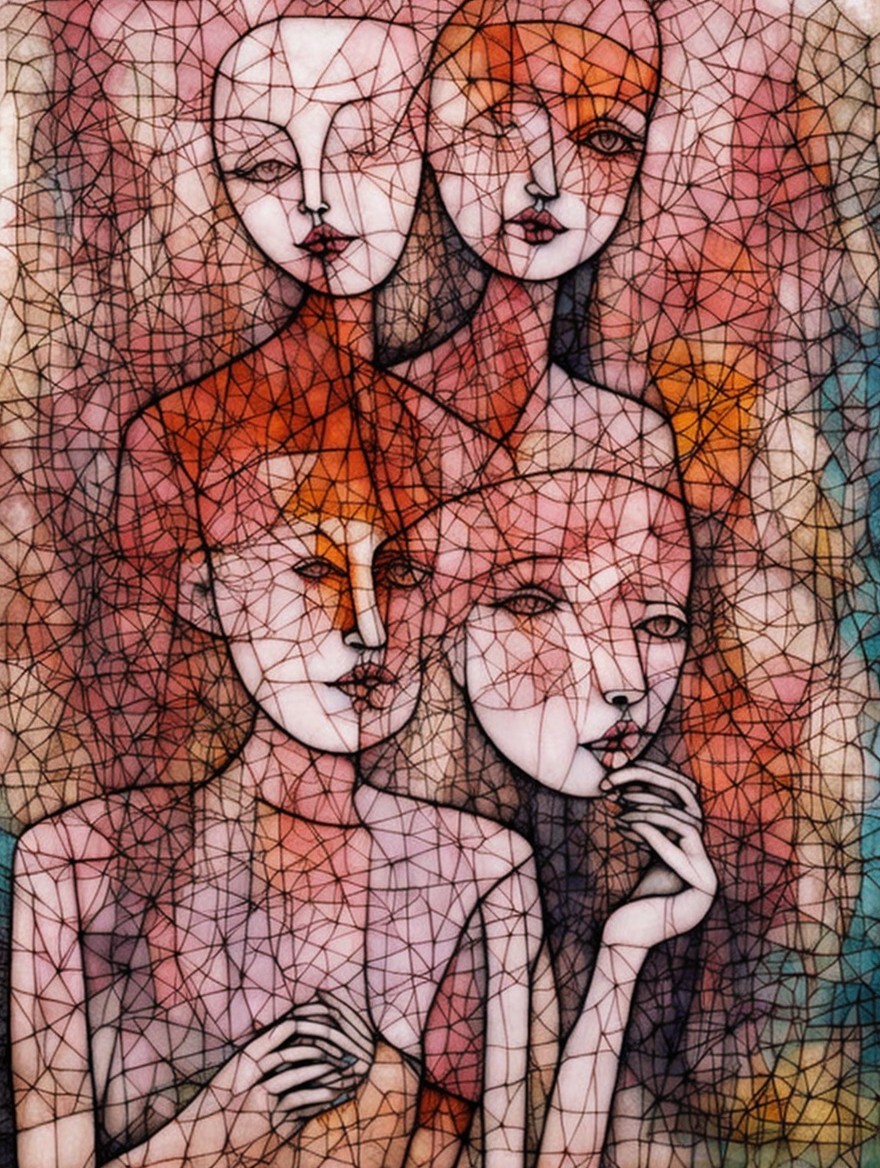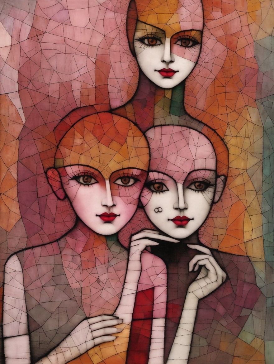 Artistic depiction of three stylized female figures with prominent eyes and red lips, in muted earthy tones with a textured background.