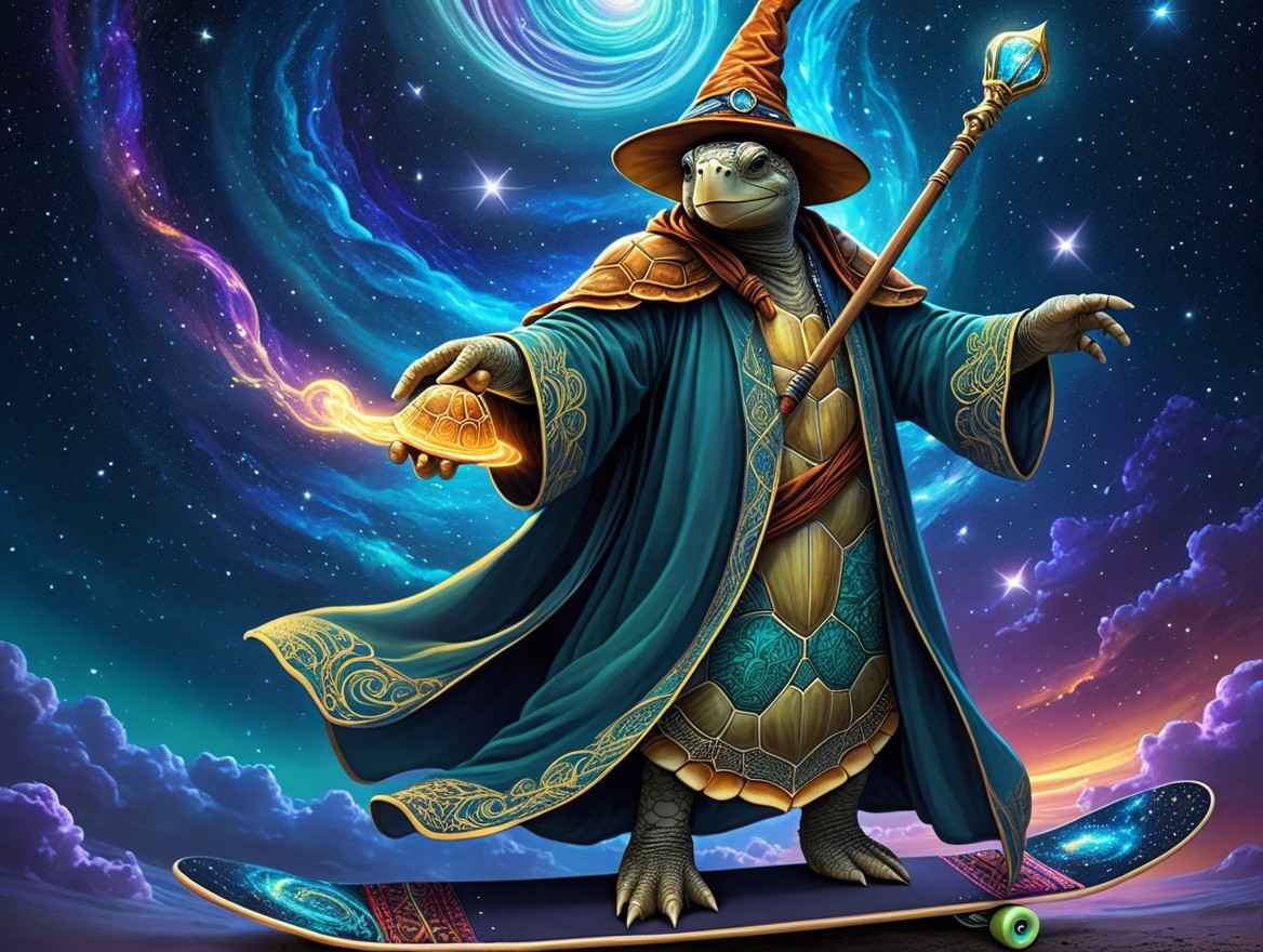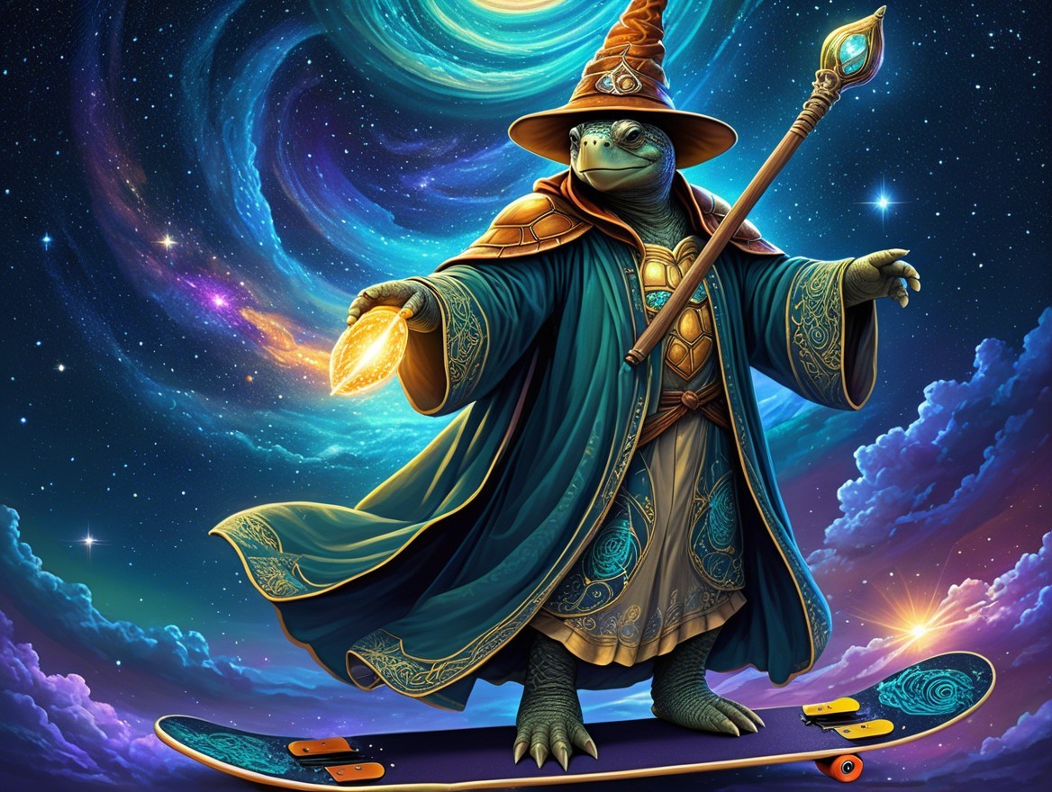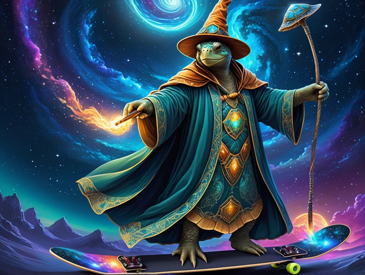 A magical turtle dressed as a wizard, wearing a flowing robe and a hat, glides on a skateboard. It casts a spell, surrounded by a vibrant cosmic background with swirling galaxies.