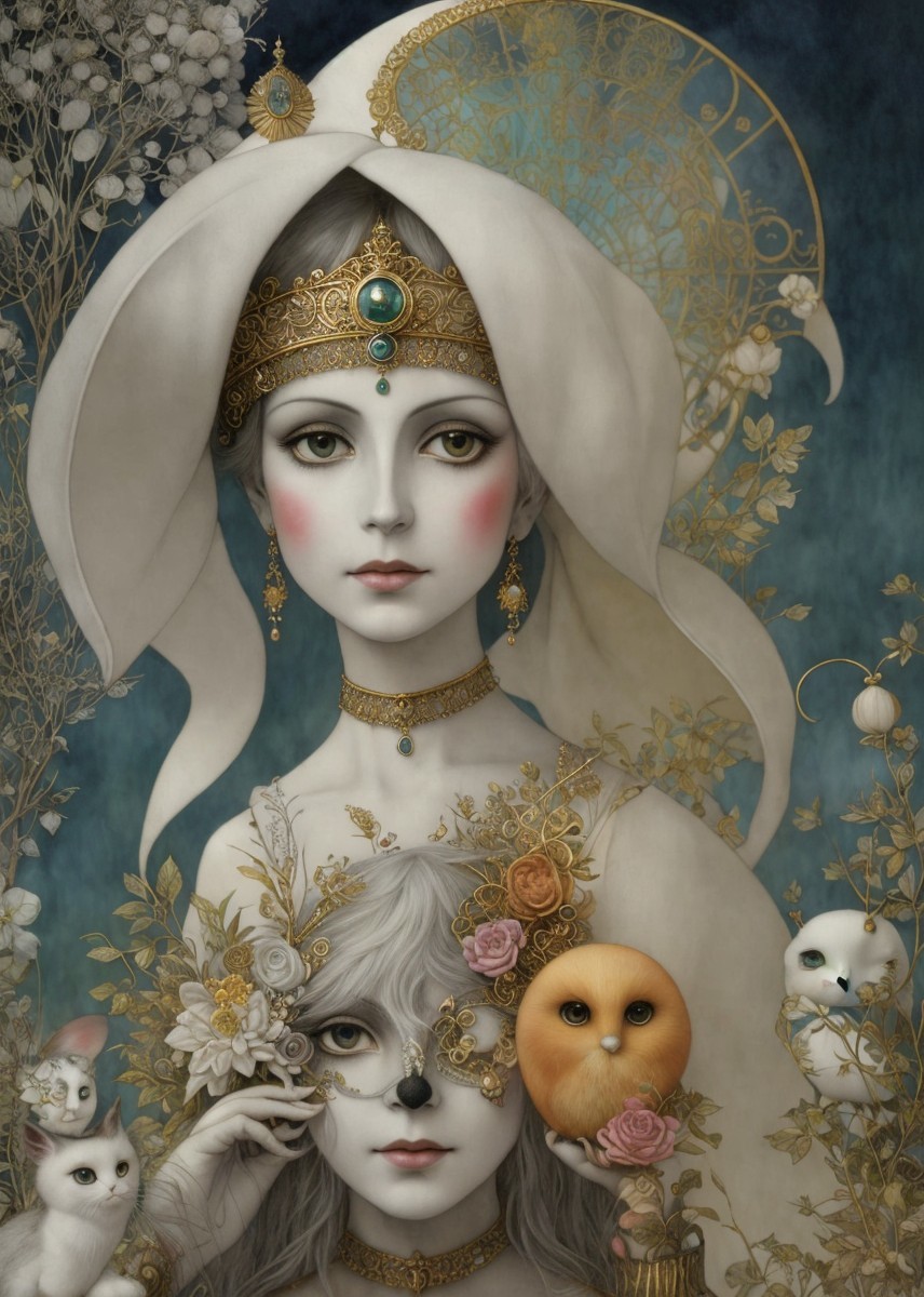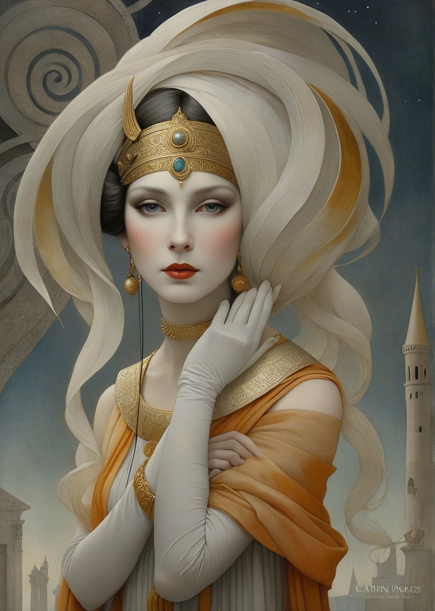 A serene portrait of a woman adorned in elaborate jewelry and a flowing gown, featuring a voluminous hairstyle. She exudes elegance against a mystical, dreamlike background.