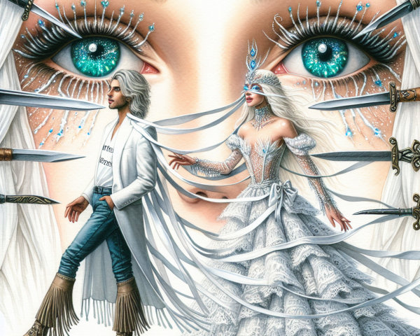 A painting of a man and woman with flowing hair, intense gazes, against a backdrop of a stormy sea and dark sky with stars.
