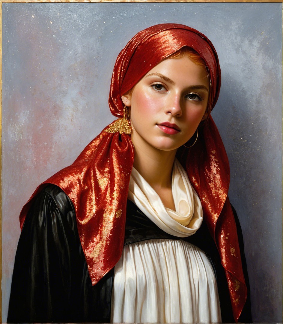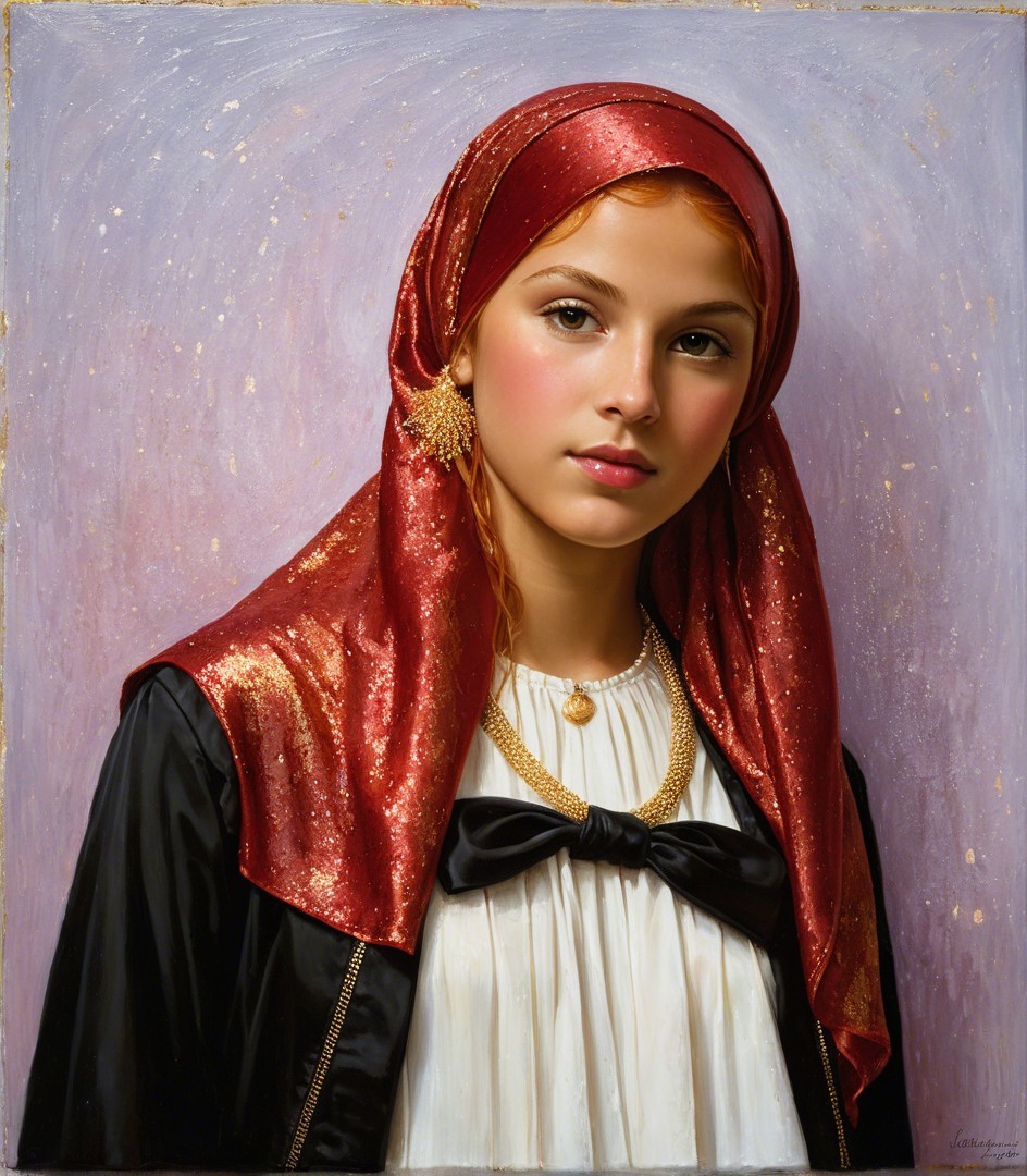Prompt: Juvenile Portrait: upper body portrait with light-red headscarf wet on wet painting, tonalism, gold sparkles, tousled red hair, flowing hair illusion, post-avantgarde, casted shadows & gold leaf effect, 3d effects, sparkles, filaments, fine linework, glitter, crackles, sequins, hues by Dee Nickerson, folk-art reminiscence, tribal, reflecting satin, flowing hair illusion, dyed, american gothic 1.7, brightness 1.6, rim lighting, raytraced shadows 1.3, sfumato, impossible light transitions merged with art-nouveau style reminiscent of William Bradley and Arlie Opal, nuanced painterly background with detailed blotting, joyful storybook illustration, lighting and embodiment by Max Liebermann, beautiful line-art with pointilism, triadic color scheme warm-pink soft metallic-honey light-pink, juminocore and indiecore details, dappled lighting, negative lucas numbers, lighting by Wadim Kashin, baroquely infused with the elegance of John Singer Sargent, painted textures resemble resin, oil, and gouache,Portrait, collagraphy with intricate details for a unique and dreamlike atmosphere. Utilize an intense color palette with HDR and UHD, debeh, bokeh, dof, textured eyes, faded ink style, unparalleled detail, paper fibers visible, paint cracks adding depth, soft eroticism in the gaze, splash ink, great depth and scale, tousled light hair, warm toned background, cartoon style, khaki, light-ochre, complexion 1.4, dynamic lighting, stylization 1.4, 128k, delicate tones in indiecore features, hues by Ed Binkley, rough paint accentuating her features, golden hour, abstract, intricate detailing, warm coloring ,vivid coloring for outlines, close-up, detailed skin textures, complexion 1.3, slightly sculpted, flowing hair illusion, dethereal