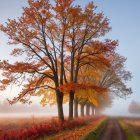 A picturesque landscape features a path lined with vibrant autumn trees, their leaves in hues of orange and red. A colorful sky and blooming flowers enhance the serene atmosphere.