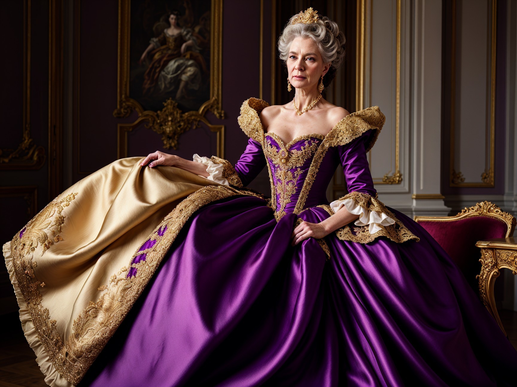 A woman in an elegant, expansive purple gown adorned with gold detailing. The dress features a voluminous skirt and off-shoulder design, set against a grand interior with classical art.