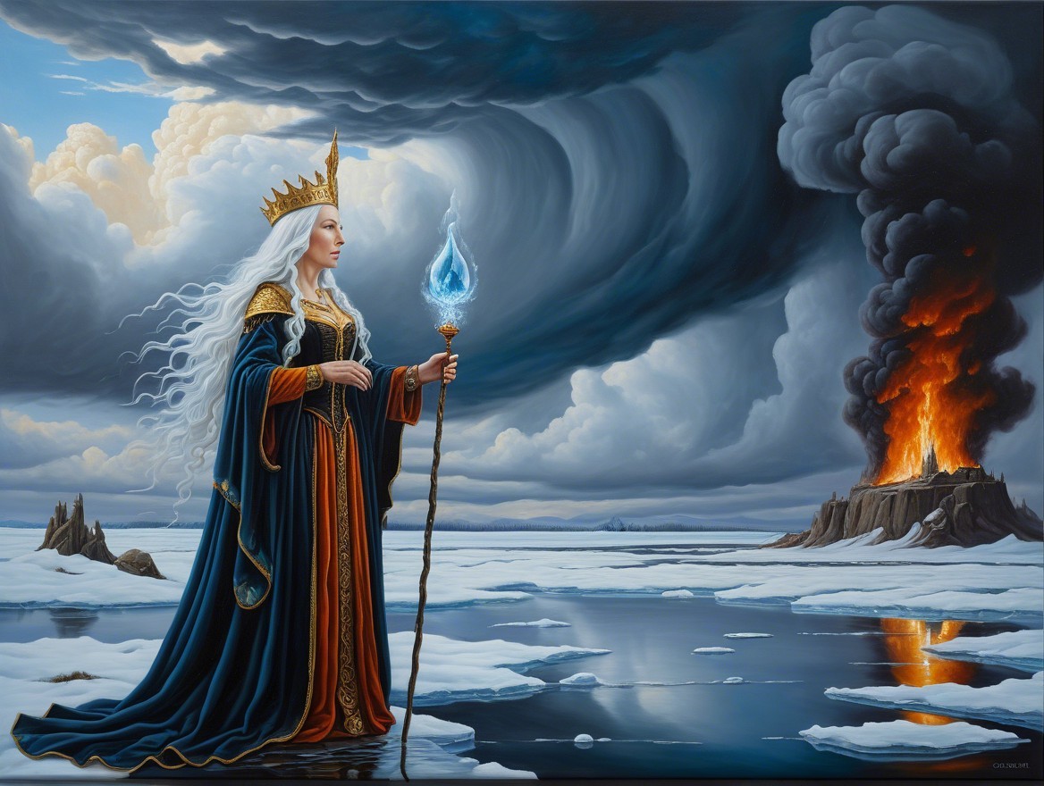 Prompt: the clouds are crying tear of ice the ground is creaked and burning but the very old wise wizard woman queen is protecting the last of the water