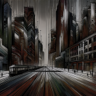 A stylized urban landscape features towering skyscrapers with a blend of red and gray hues. A train travels along a dynamic, linear track, while pedestrians stroll the city streets in the foreground.