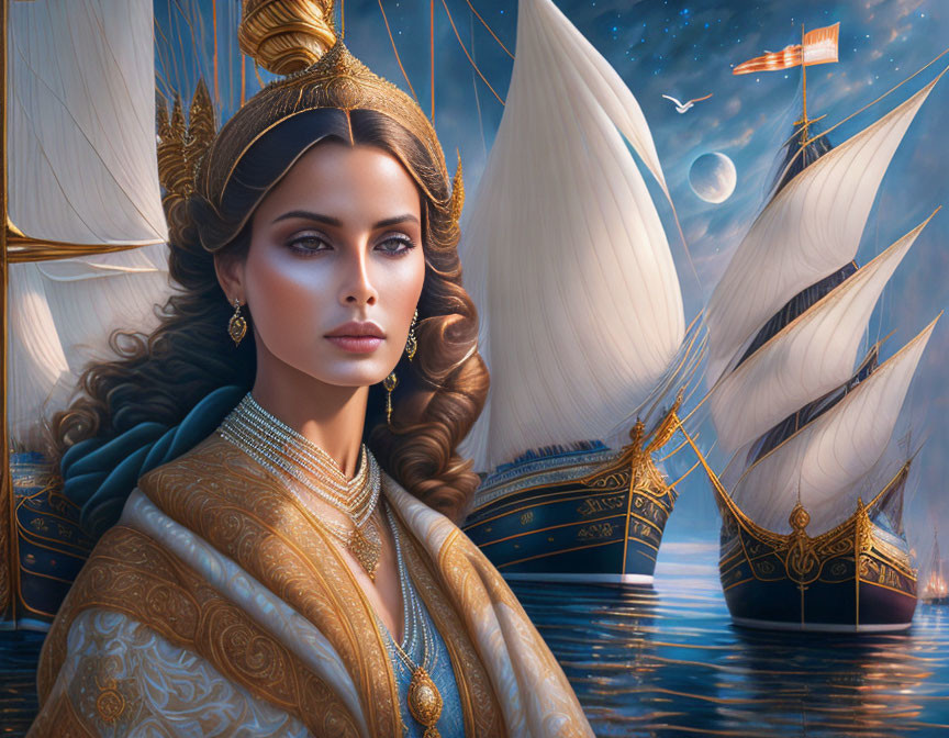 Beautiful woman on a dream ship. beautiful symmetrical eyes and beautiful lips.