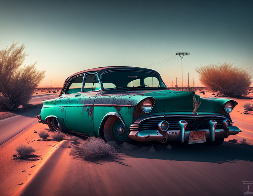 an abandoned car on the highway, tumbleweeds, desert all around, incredible sunset