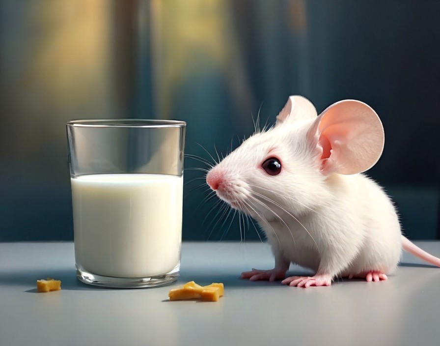 White Mouse Next to Milk and Cheese on Reflective Surface
