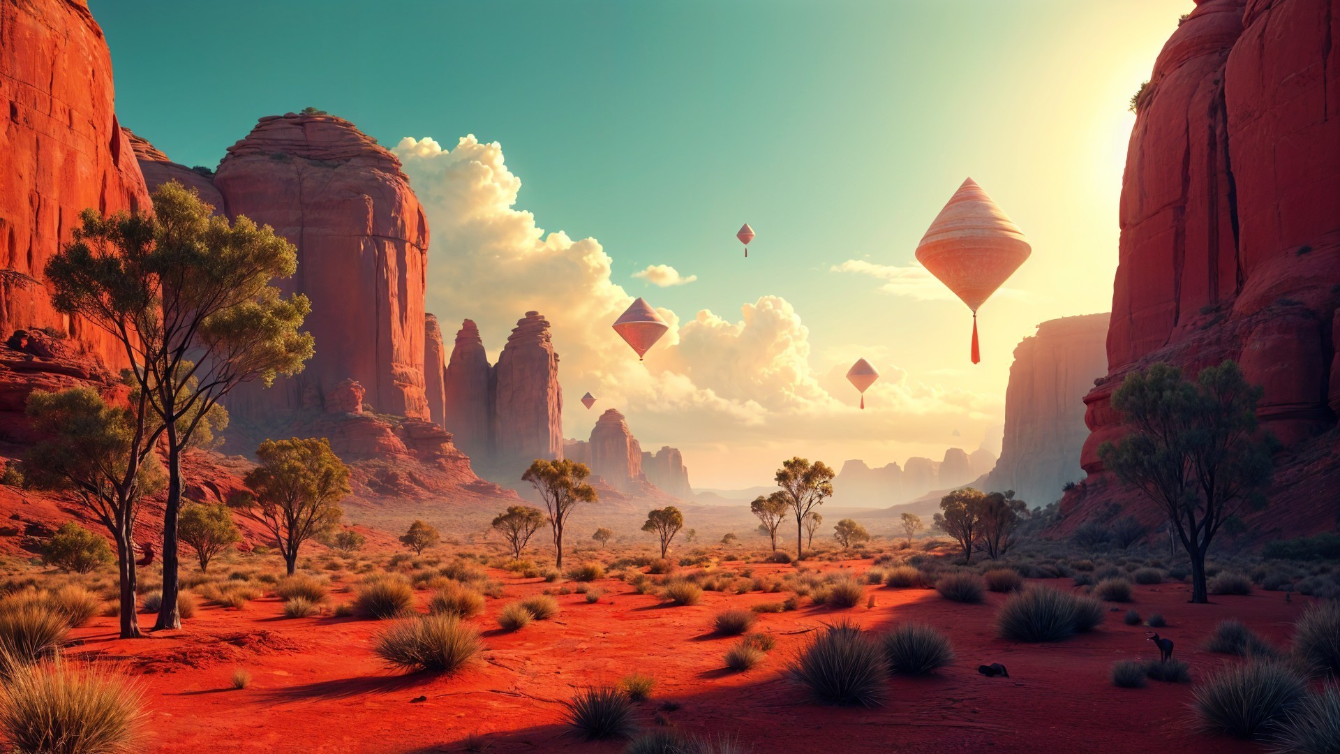 A stunning desert landscape features towering red rock formations, sparse vegetation, and colorful clouds. Otherworldly planets float in the sky, adding a surreal touch to the serene scene which is mostly like that stretch of the desert between New Mexico and Arizona in which the Interstate and the railroad pass through the same area.