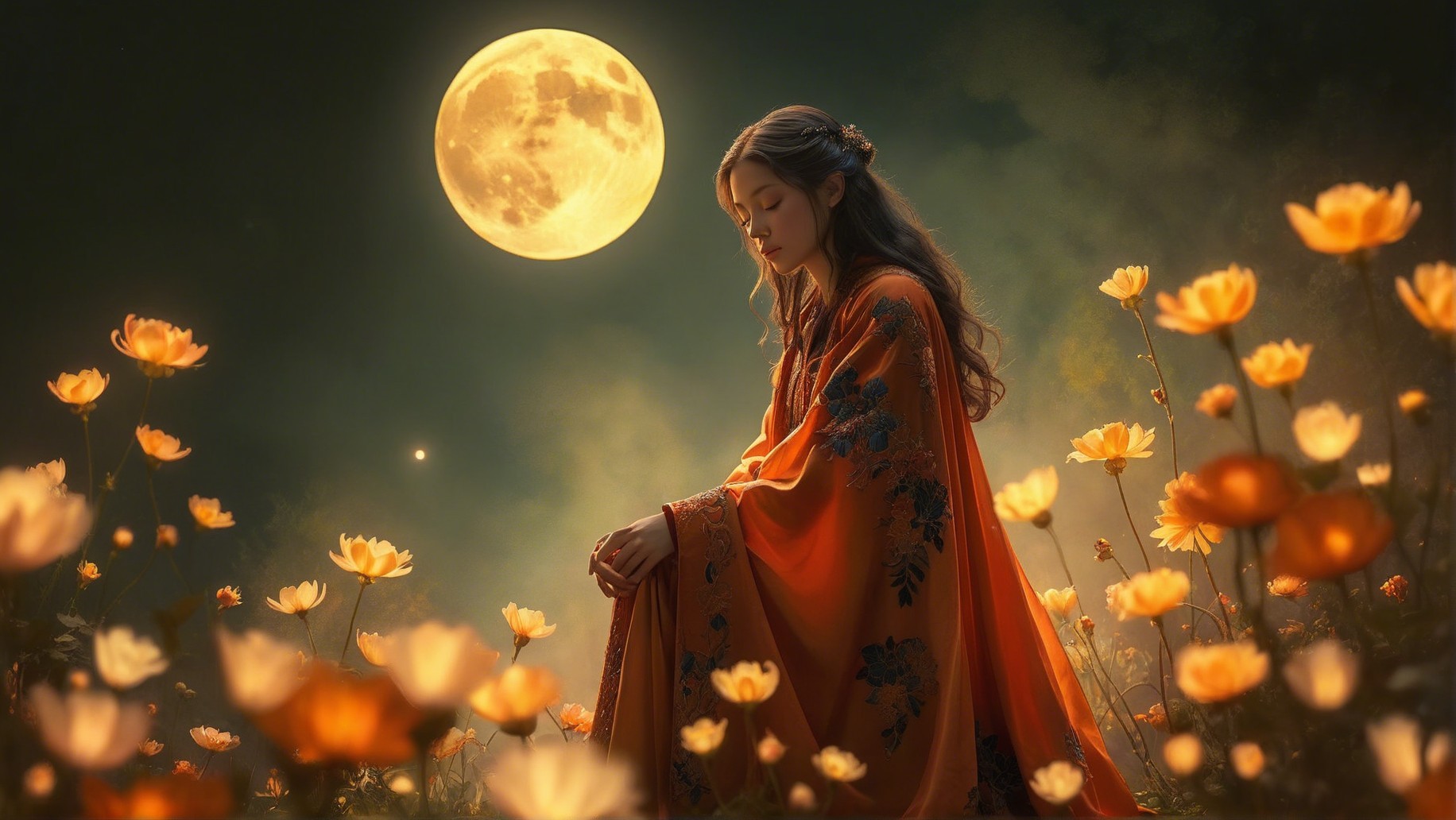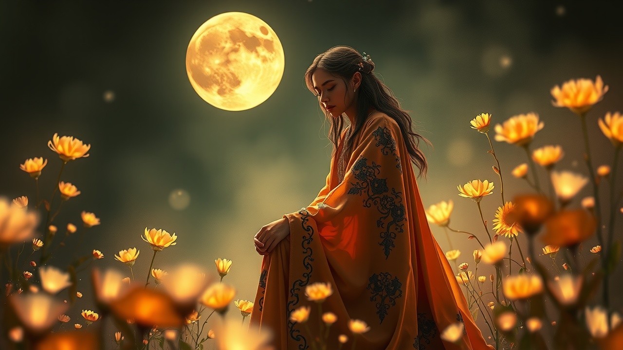 A serene figure in an orange flowing garment sits among vibrant flowers, bathed in the glow of a large, luminous moon, creating a dreamy, magical atmosphere.