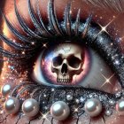 A close-up of a glamorous face adorned with intricate makeup. Striking blue eyes are highlighted by vibrant purple hues, with elaborate embellishments featuring pearls and sparkling gems.
