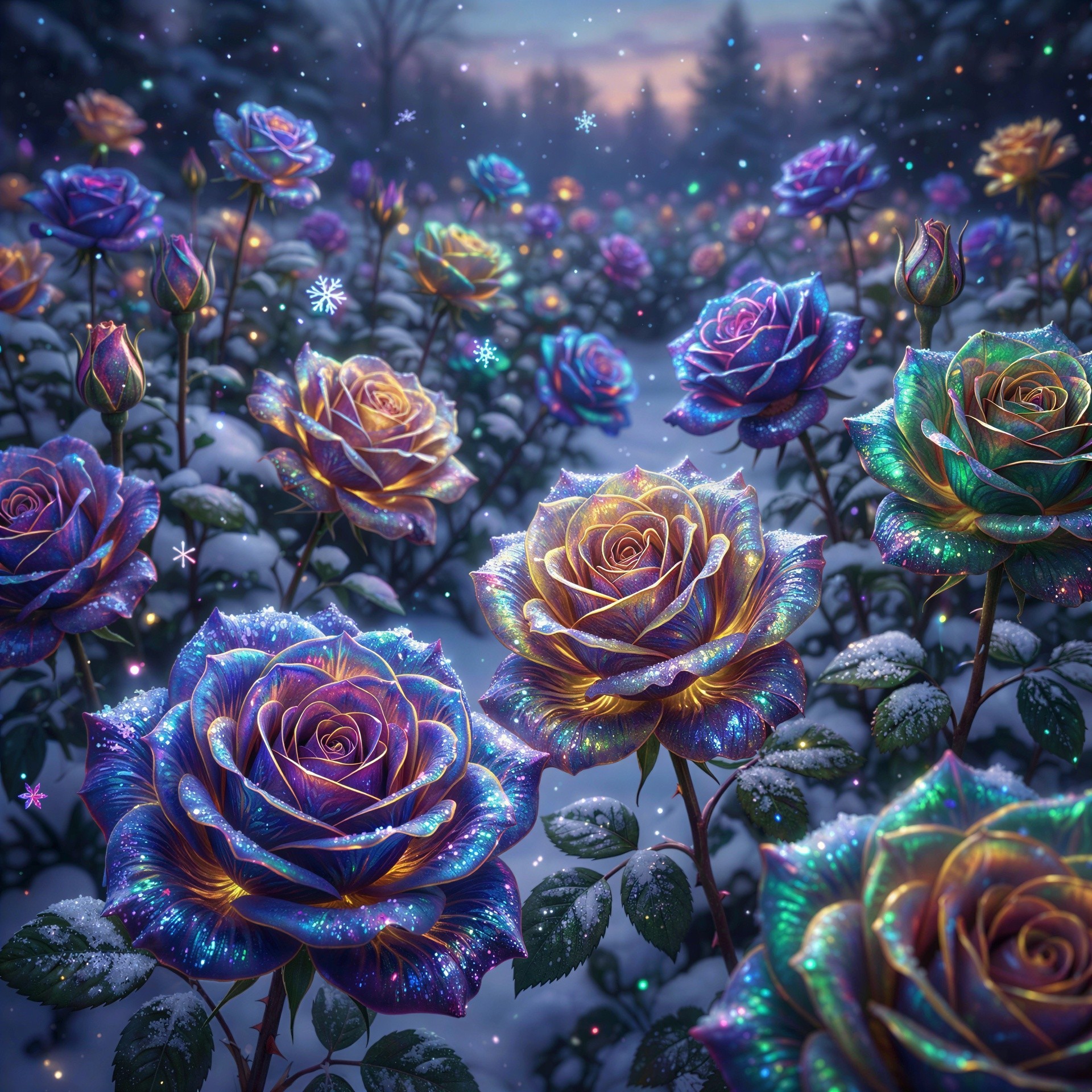 A winter wonderland scene features a field of bioluminescent roses in shades of blue, purple, gold, and green emerging from a blanket of glittering snow beneath a starry night sky. The foreground is dominated by a majestic blue rose with golden highlights, its petals dusted with iridescent sparkles, contrasting with the frosty white