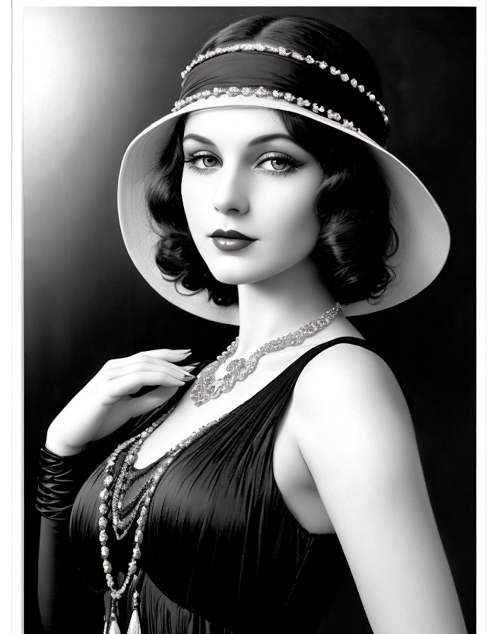 Prompt: "Black and white Full image of a 1920 party girl. poster girl posing, Beautiful fine art, 1920 party girl with a flapper dress, beautiful stunning details, by Catherine Abel"
