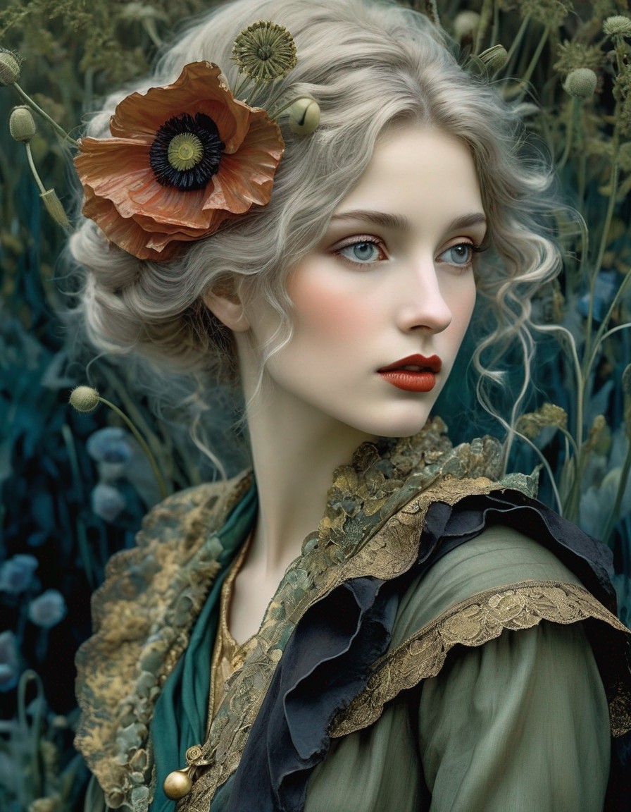 + Prompt:Single image. Art nouveau. The quantum nature of things. A nymp in the field. poppies. colors: mimosa, olive, mustard, chocolate dark green, metallic copper, metallic bronze.