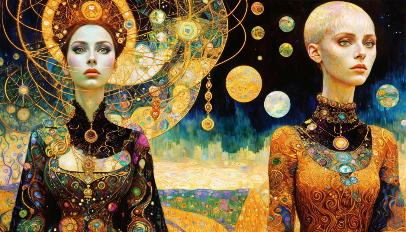 Witches of demonc beauty, meged double exposure mixed media, Gustav Klimt, intricate high detail crisp quality cosmic Francis Bacon Beksiński Jack Kirby