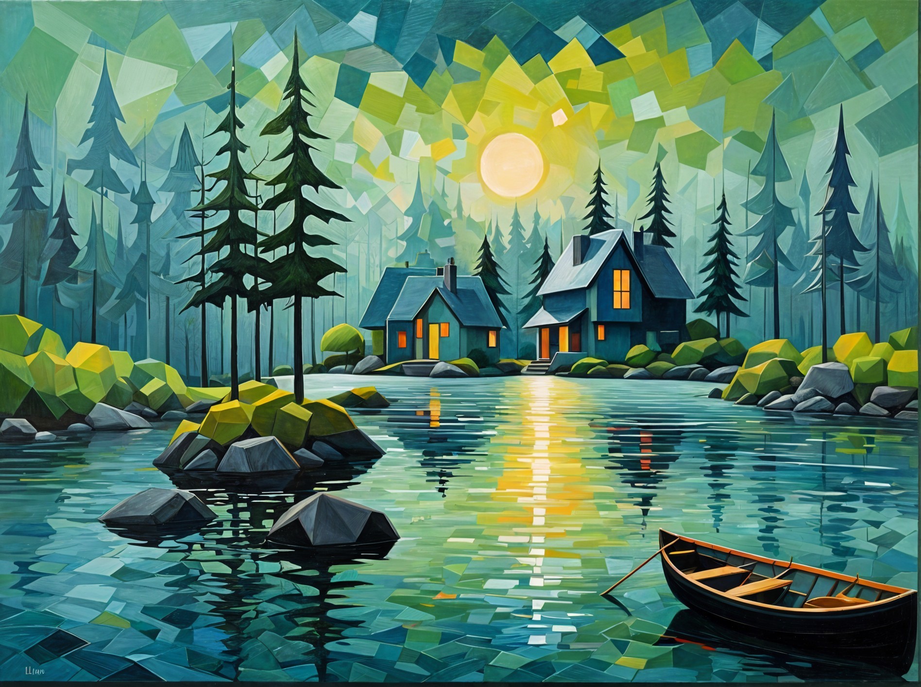 A vubist landscape: a lake surrounded by tall pine trees. Setting sun reflects on the water