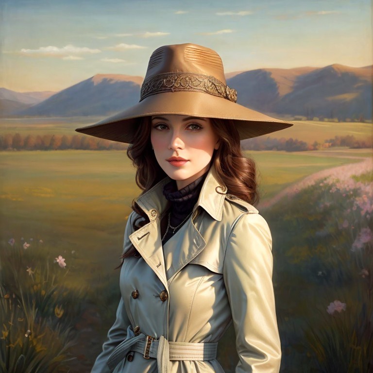 (Try from Vincent Godard) - A stylish woman in a wide-brimmed hat and a light trench coat stands against a picturesque rural landscape, featuring rolling hills and a clear sky, exuding confidence and elegance.