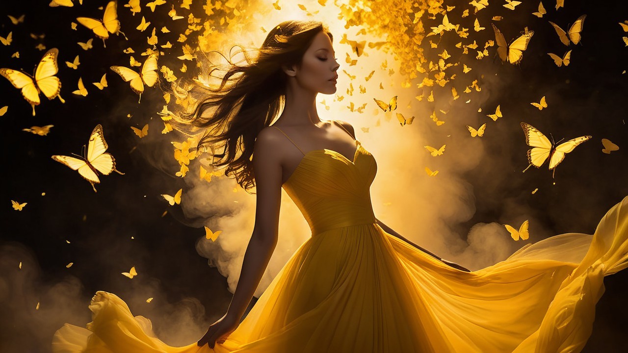 (Try from Beate Vogl , original from EmmAI) - A woman in a flowing yellow gown stands gracefully amidst a swirl of golden butterflies, illuminated by a warm, ethereal light that highlights her serene expression and flowing hair.
