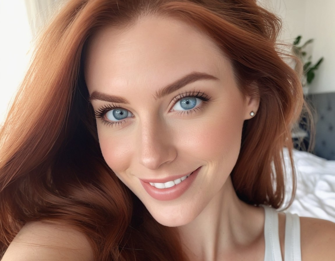 A woman with red hair and blue eyes is smiling at the camera, with a photo of herself in the background.