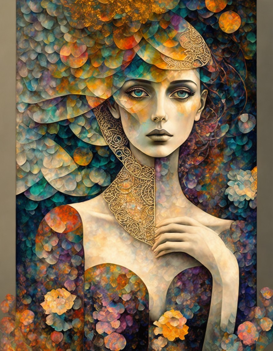 A fantastical artwork of a woman with ornate, metallic headpieces, surrounded by colorful, iridescent circles reminiscent of scales or bubbles.