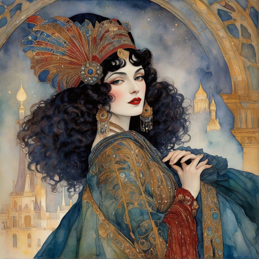 + Prompt:Klimt paint affiche for Moulin Rouge spectacle in Paris, soft watercolor extra water in Art Deco by Annigoni, Egon Schiele, Milo Manara, Botticelli, Catrin Welz-Stein, Jean Metzinger, Klimt, perfect eyes, perfect handsface, highly detailed, complementary colors, hyper detailed. Watercolor and ink splatter, dynamic pose, dark blue background, unreal engine, greg rutkowski, loish, rhads, beeple, makoto shinkai and lois van baarle, ilya kuvshinov, rossdraws, tom bagshaw, alphonse mucha, global illumination, detailed and intricate environment