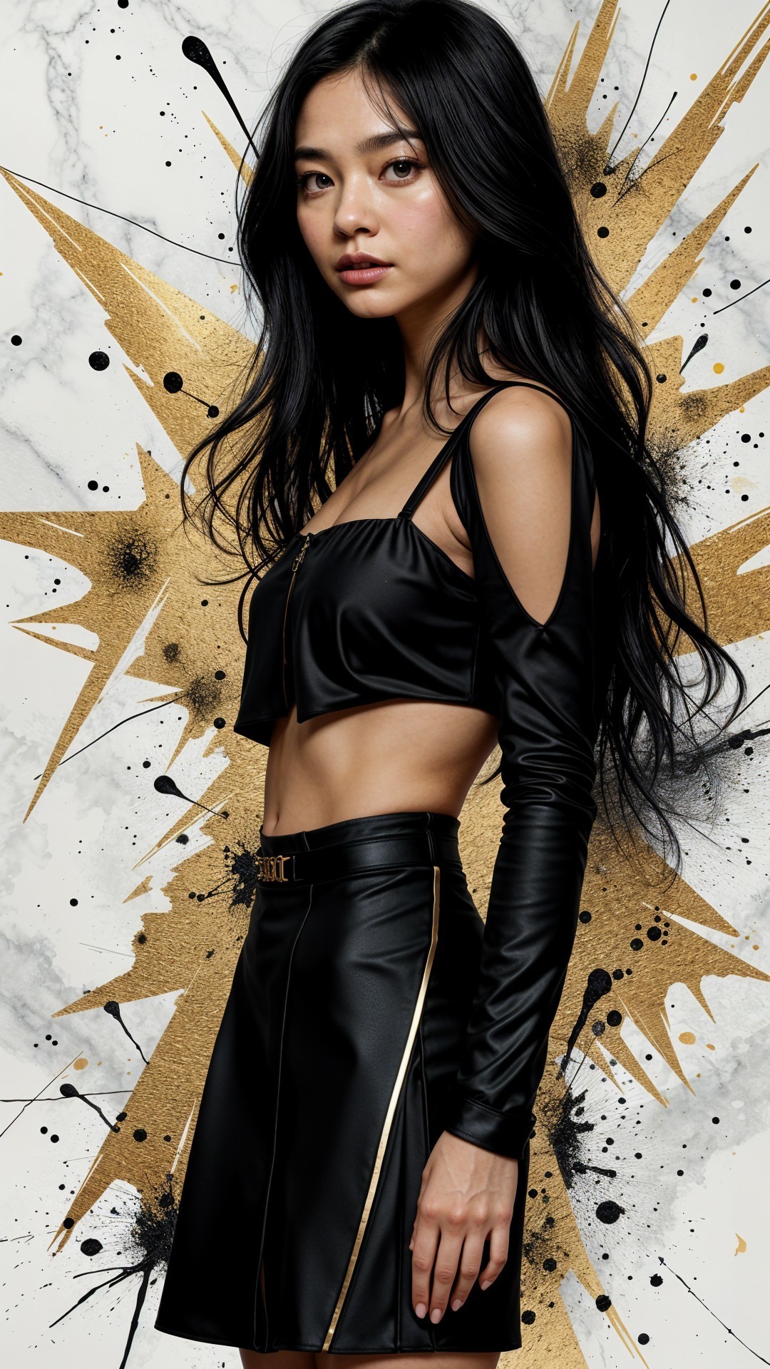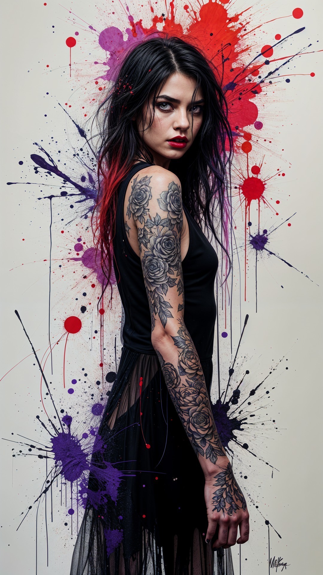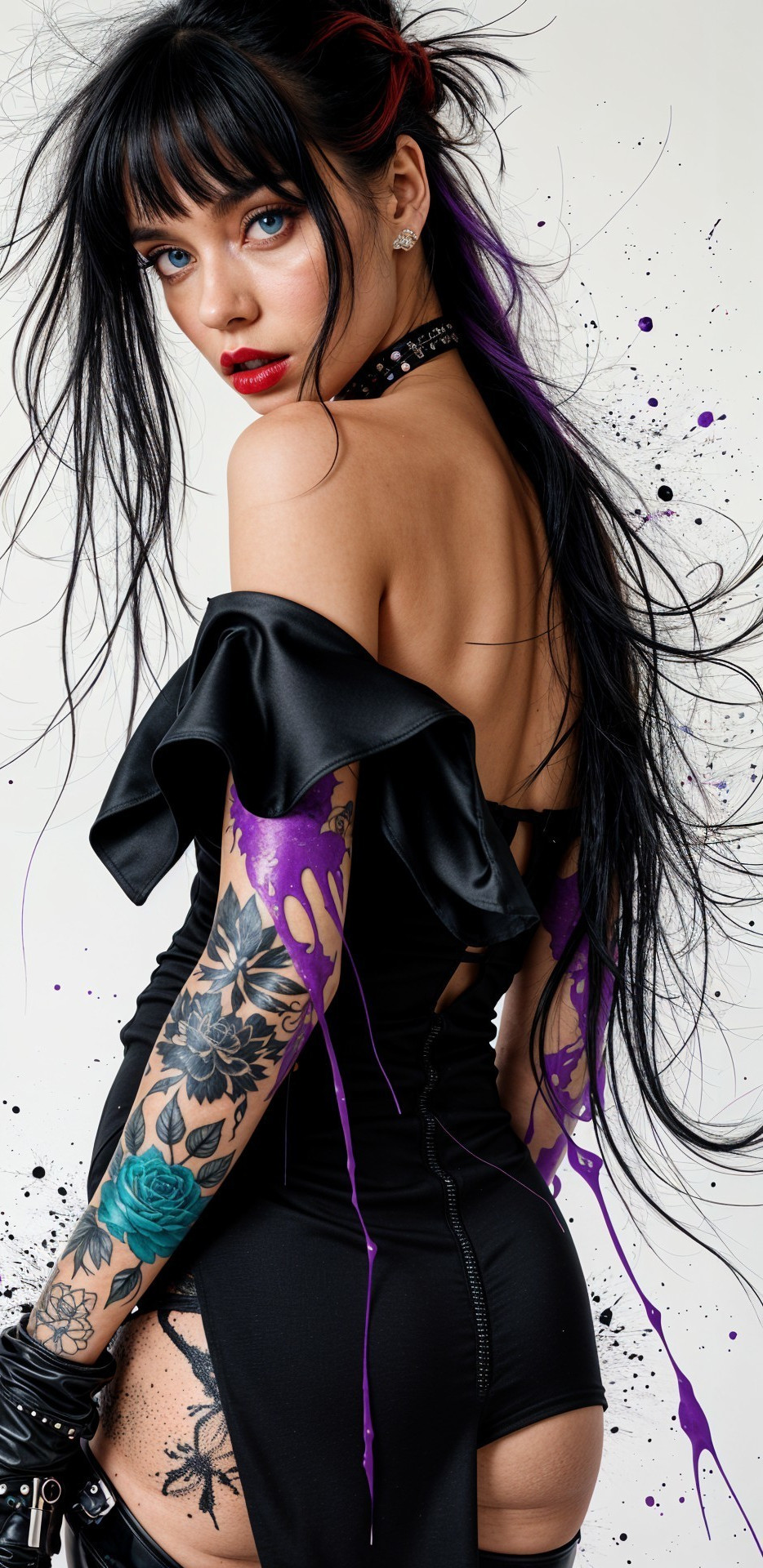 A side profile of a woman with dark hair and striking orange eyes, adorned in a black dress. The background features an artistic splash of black and orange paint, enhancing her ethereal presence.