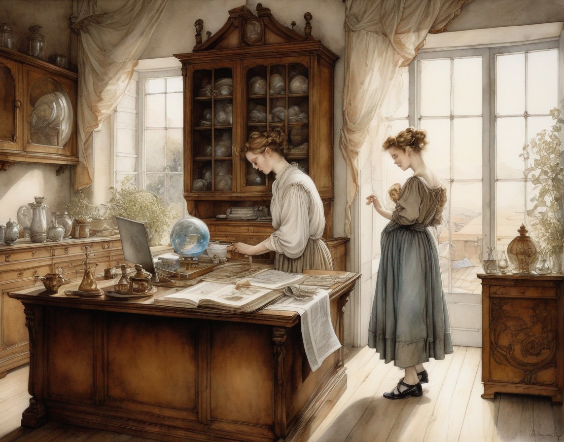 A woman in a vintage dress stands by a window, gazing out to sea, in a room adorned with a mirror, globe, and elegant furniture.