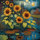 A vibrant landscape features oversized, stylized flowers in radiant hues, surrounded by lush greenery and a tranquil pond. Mountains rise in the background under a colorful sky, evoking serenity.