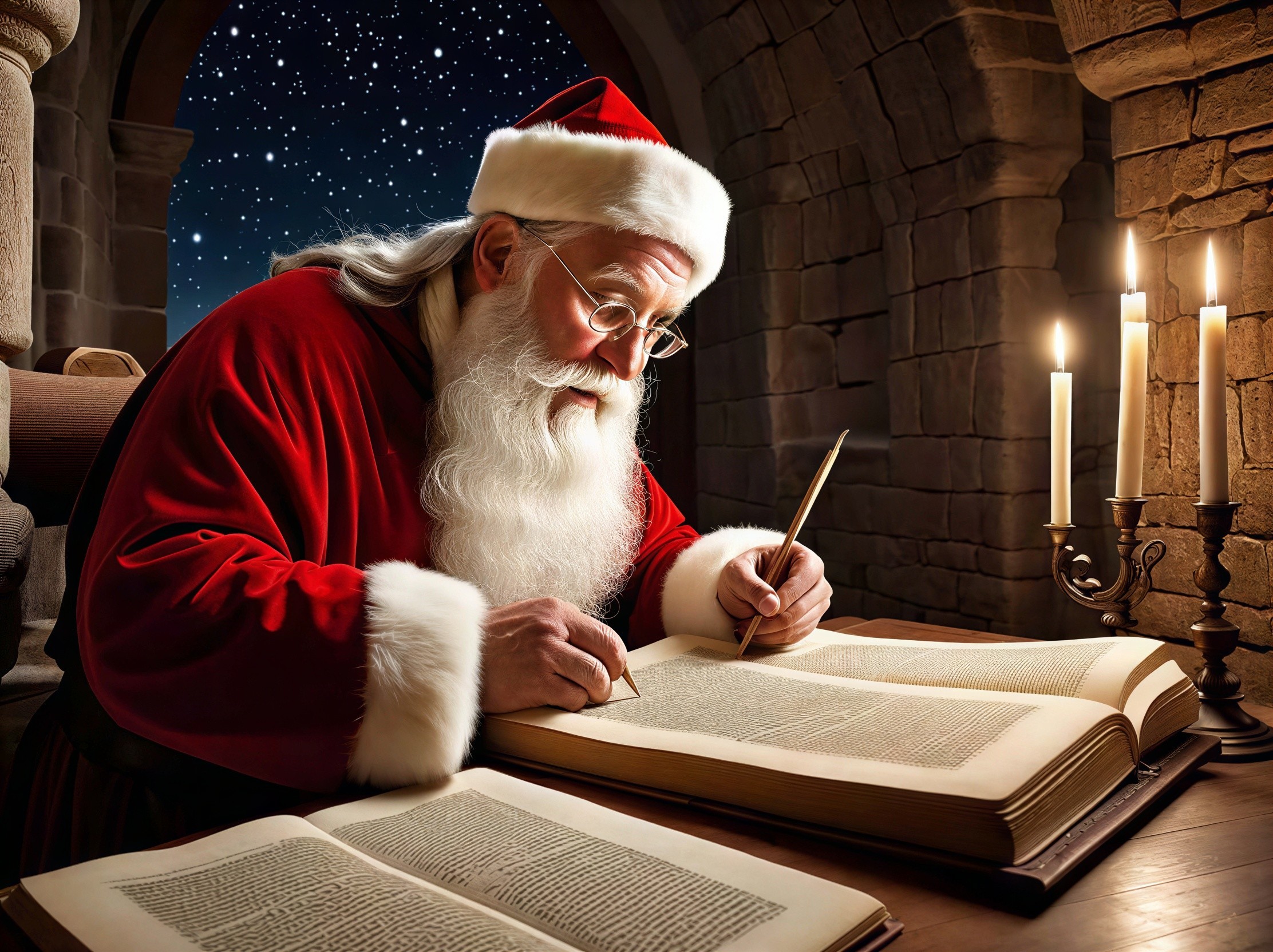 Santa Claus, adorned in his iconic red and white suit, including a plush red cap and a velvety red robe with white fur trim on the cuffs, is diligently engaged in writing. He sports a long, flowing white beard and a matching white mustache, complemented by long white hair that extends from beneath his