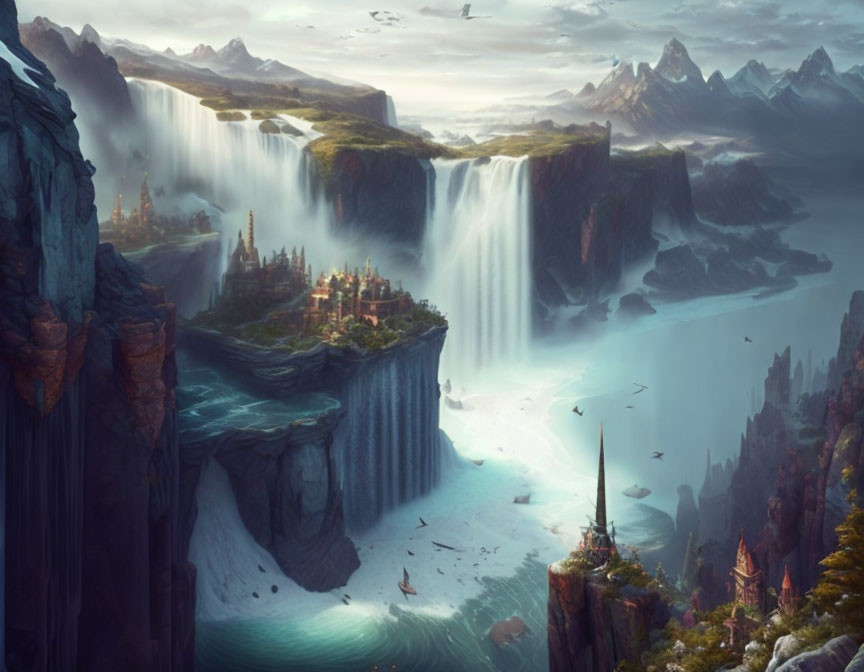 Fantastical landscape with violet spires, waterfalls, floating islands, and ornate ships under