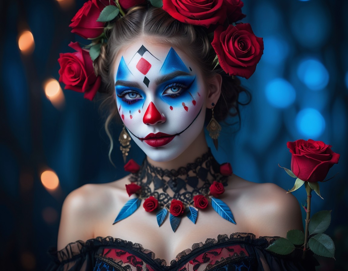 (Mixpromt from marek zarnovicky) - The image features a surreal character with intricate body art. Her striking blue and red makeup contrasts with organic, tentacle-like elements incorporated into her attire and hairstyle.