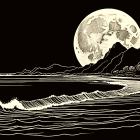 A striking black and white scene depicts a moonlit coastline. A large moon casts a luminous glow over the waves, rocky cliffs, and quaint houses, creating a serene, enchanting atmosphere.