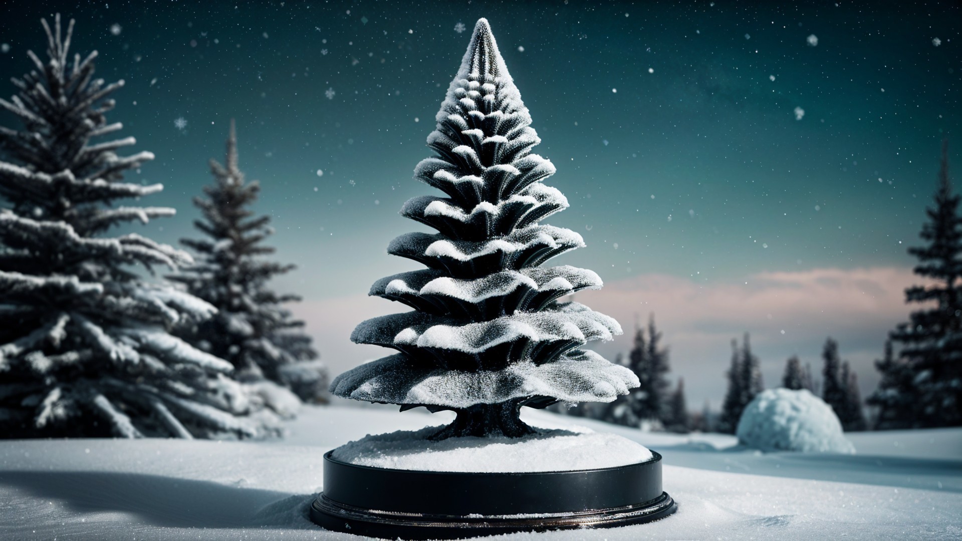 Prompt: "A stock photo of a Tintype-inspired christmastree dusted with snow, nestled in a winter wonderland, ice formations glimmering like jewels, soft natural light illuminating the scene, extreme erroneous subsurface scattering, vertical layout, emulsion lifts, wrapped in aluminum-latex membrane; whimsical gothic elements, vibrant hues; optical glitch anomalies, data bending, analog errors; background of a serene winter landscape with soft white snow, gentle pastel skies, and delicate falling snowflakes; high resolution, 8k, conceptual illustration, ArtStation trending, highly detailed;"