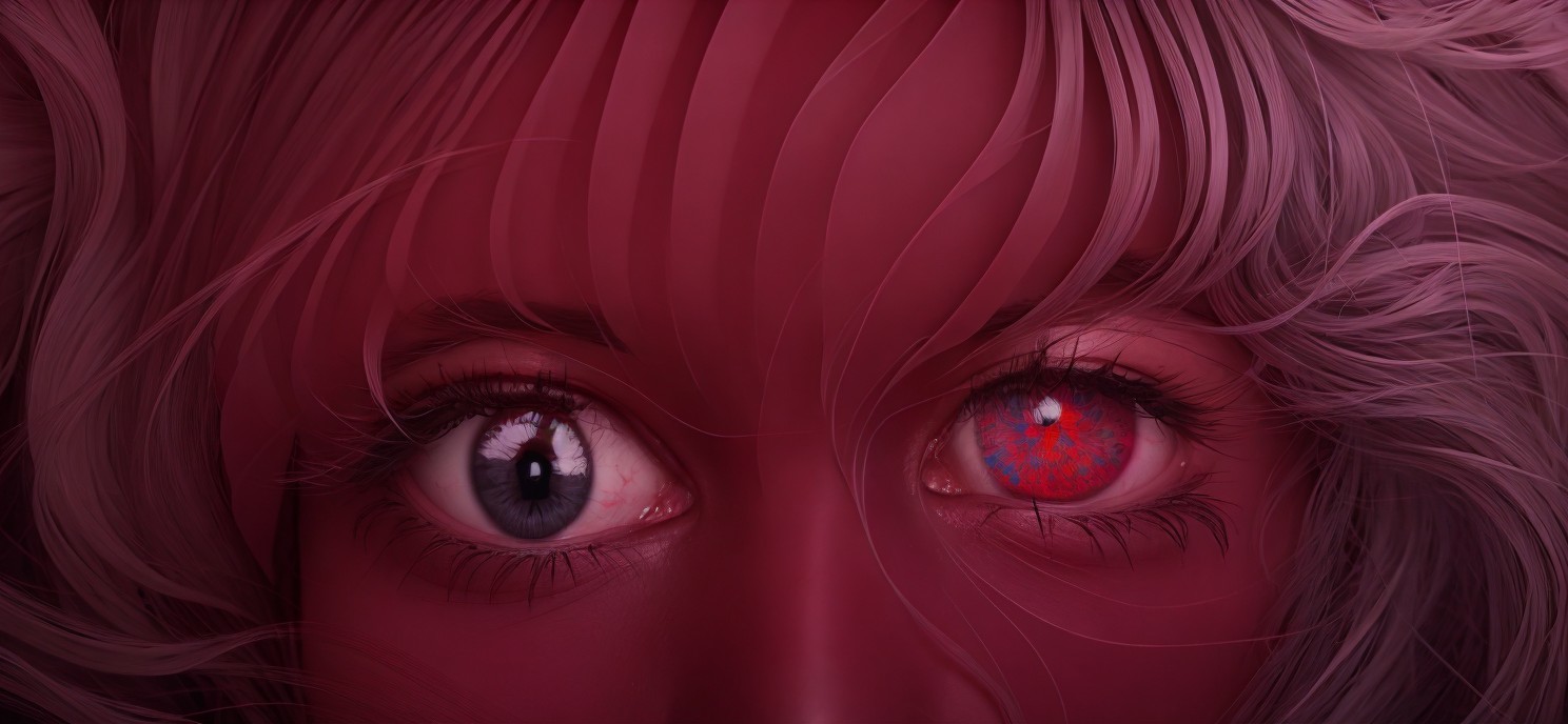 The image features a close-up of a face with striking blue eyes and wavy hair. The background is a deep red, creating a dramatic contrast that enhances the eyes' vividness.