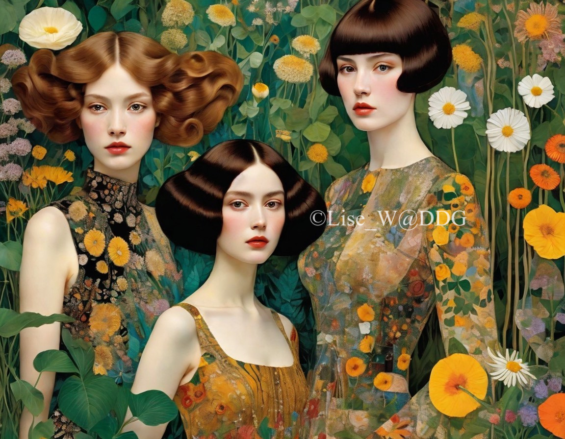 Three women blend into a vibrant garden background, creating a dreamlike tableau.