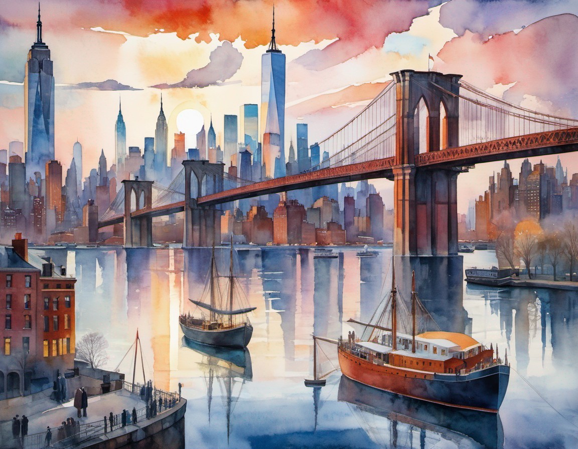 Prompt: at sunset, watercolour patchwork by Picasso and Caspar David Friedrich, Edvard Munch and Daniel Merriam. the background is new York cityscape in the syle of Igor Dubovoy