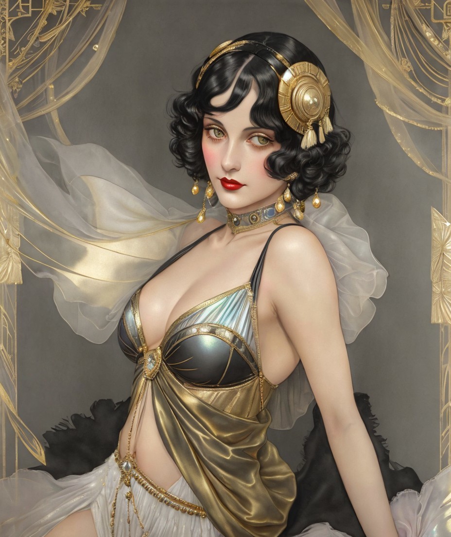 1920s "Ziegfeld Girl.Art deco with 3d detail and golden foil, double image, Egon Schiele, dynamic poses, silk iridescent texture in watercolor and ink, shades of black, greys with gold foil detail,colored ink drawing, watercolor artwork on old withered paper, vintage, by Caravaggio, Fragonard, Anton Pieck, pale colors, high detail, intricately detailed, hyperdetailed volumetric lighting, art nouveau graphic steampunk., whimsical, beautiful, poignant, touching. colors rose, gold, rust, burgundy, black.soft watercolor extra water in Art Deco by Annigoni, Egon Schiele, Milo Manara, Botticelli, Catrin Welz-Stein, Jean Metzinger, Klimt, perfect eyes, perfect handsface, highly detailed, complementary colors, hyper detailed
